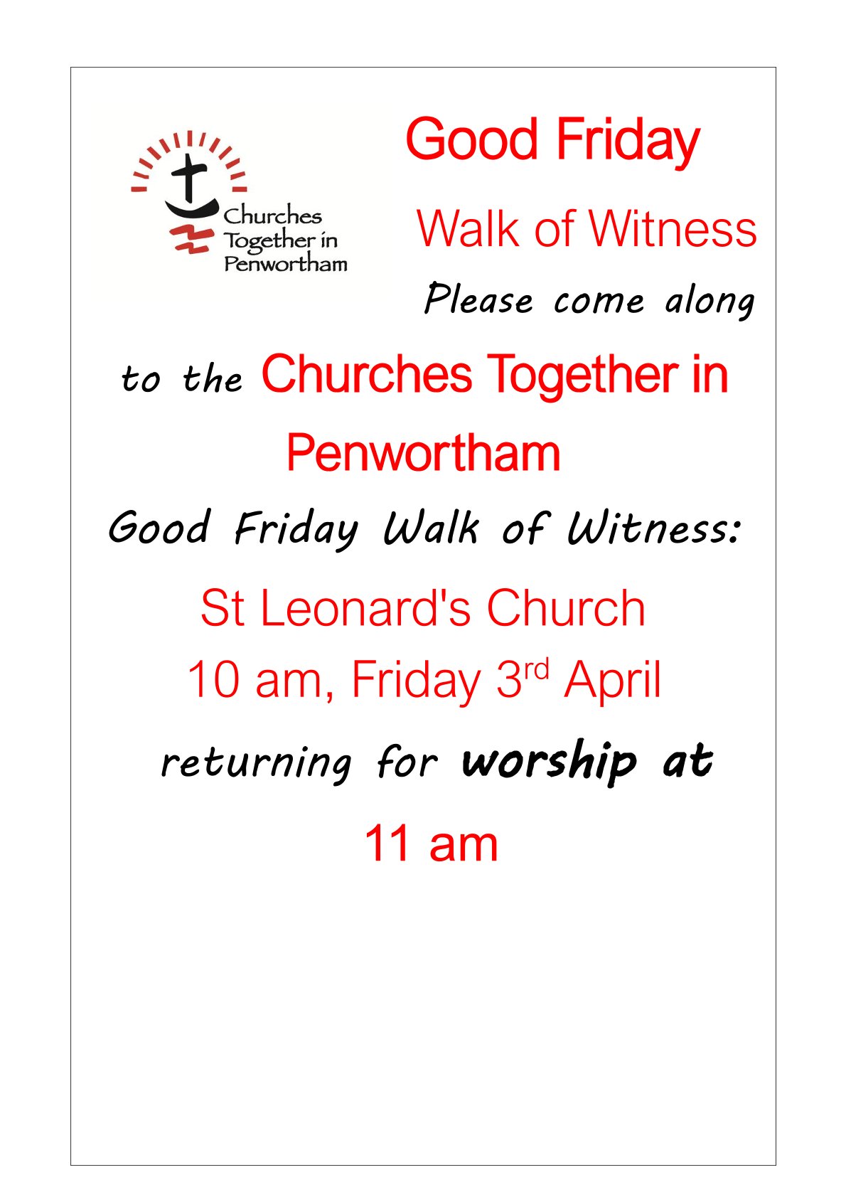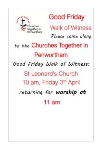 The 2026 Churches Together in Penwortham, Ecumenical Good Friday Walk of Witness and Church Service is being organised by our friends at St. Leonard’s Church, Marshalls Brow Penwortham on 03 April 2026. There will be a modest walk at 10:00am beginning and ending at the church and followed by Good Friday Worship at 11am. Click the icon on the left for the Poster.