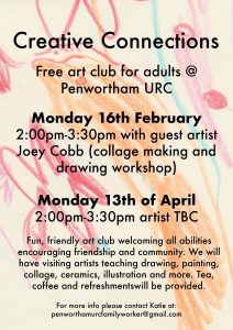 The 2nd Session of the free afternoon art club for adults is being held at Penwortham United Reformed Church. For details click the Title above and then on the poster icon on the left.